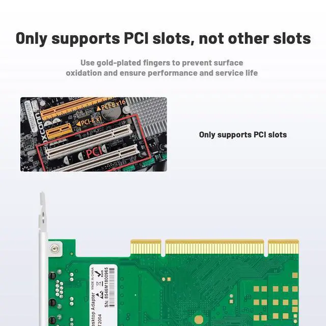 PCI portPay attention:the port of the ethernet card is PCI,only supports PCI slot,doesn't supports other slots,such as PCIE.The network adapter supports half duplex and high duplex mode.Each PCI RJ45 port have unique Mac address