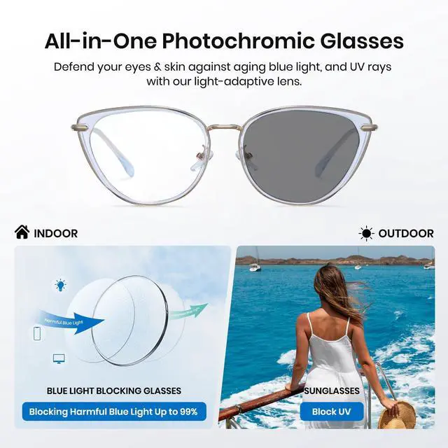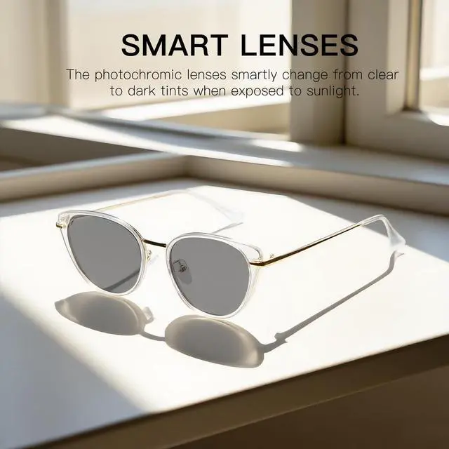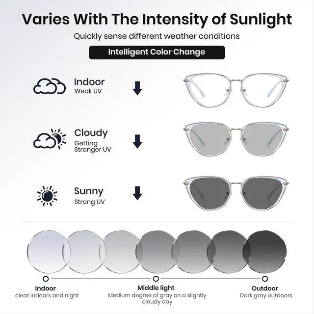Any Light: Smart lenses automatically adjust to changing light conditions, ensuring clear vision indoors and outdoors while reducing eye strain ^^ Blue Light Blocking for