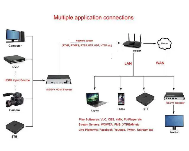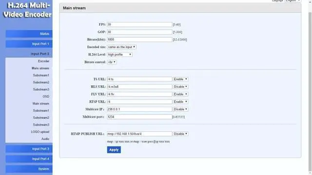 Support 4 channel 1080P or 2 channel 4K30 HDMI inputs ^^ H. 265, H. 264 high/main/baseline profile video code ^^ AAC/MP3 audio compression ^^ RTMP/RTMPS/SRT/RTSP/UDP/RTP/HTTP/HLS/FLV/TS Protocols ^^ Support 4 logo or txt or fly txt watermark (word or image) each channel