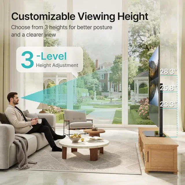 Whether you choose a 90''86'', 85'', 80'', 77'', 65'', 60'', 55'', 50'', or 43'' TV, Its versatile enough to fit your space. It is fully compatible with VESA-compliant Samsung, Sony, and LG LCD OLED Flat/Curved Screen TVs, offering a practical solution for your home. ^^ Flexible Height & AngleWith a tilt range of +5 to -10 and a 35 swivel, this standing tv mount allows you to position your TV exactly as you prefer. The adjustable height range ( 23.3" to 28.3" ) provides greater flexibility for various TV cabinets.