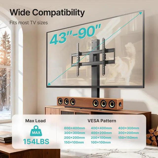 Heavy-Duty DesignOur large tv stand features a 100% full-coverage steel column, constructed from 30% thicker, high-density industrial-grade steel, and has passed 3x load-bearing tests. Paired with a high-hardness 23.62 x 12.6 -inch tempered glass base, it can easily support TVs weighing up to 154 lbs. Engineered for security, this tv stand swivel provides a solid, stable base for your TV, protecting it from accidental knocks or shifts and ensuring a worry-free experience. ^^ Universal VESA compatibilityDesigned for versatility, this universal swivel tv stand supports VESA sizes from 100x100mm to 600x400mm and fits TVs ranging from 43'' to 90''.