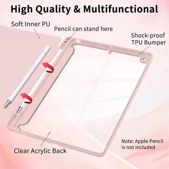 Note: NOT compatible with any other models. Case ONLY, Pencil is NOT included ^^ High Quality & Full ProtectionDurable PU leather exterior and soft microfiber interior prevent your tablet from being scratched. Hard PC back shell with flexible TPU frame provide great protection ^^ Trifold Stand CoverFeaturing a classic tri-fold stand design with two folding angles, making it easy for typing and viewing. Built-in pencil slot can conveniently storage your pencil at any time. The built-in magnetic strip can Auto Wake/Sleep your device ^^ Show Your PersonalityTransparent hard back cover shows off the original beauty of the tablet. You can attach stickers to personalize your case. It is a great choice on Birthday, Anniversary, Christmas, New Year, and even on a daily basis.