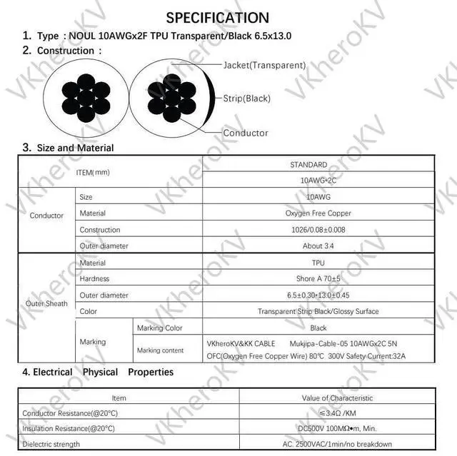 • Construction: 1026/0.080.008(Wire core)*2 Conductors, Conductor Resistance:3.4 /KM, Insulation Resistance:DC500V 100Mm, Min Dielectric strength:AC. 2500VAC/1min.