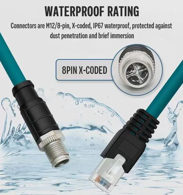 M12 X-code RJ45 Plug ETHERNET Cable is a single foil twisted pair cat5e cable with a blue PUR jacket rated at 24 AWG wire M12 Connector with gold plated X coded contacts ensure reliable connectivity ^^ High flex, shielded, heavy duty cable, Use an oil- and heat-resistant flexible vinyl material, Over-molded durable plugs, with strain relief, For Industrial Machinery, Ethernet, Power ^^ Waterproof rj45 male to female cable for outdoor LED display, IP68 connector for Urban lighting. ^^ Right Angle X-Code Cable, 1M length (3M/2M/5M/10/20M also can be make) ^^ Each cable assembly is fully tested for pin-pin continuity, to ensure that there are no potential breakdown problems.