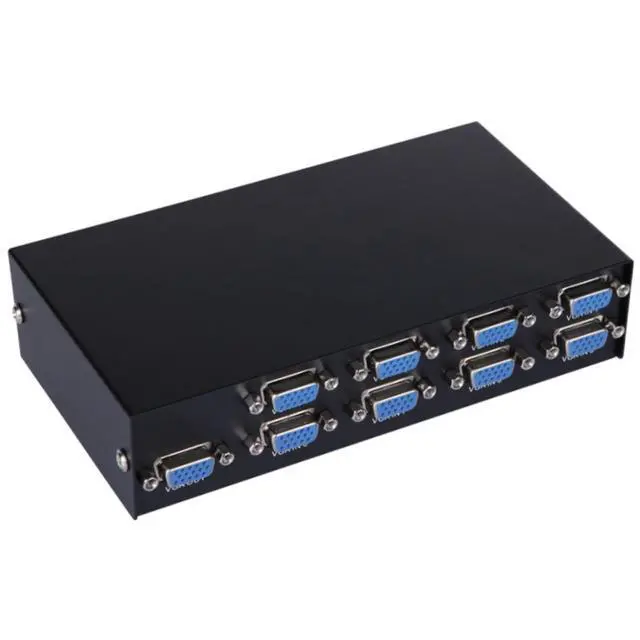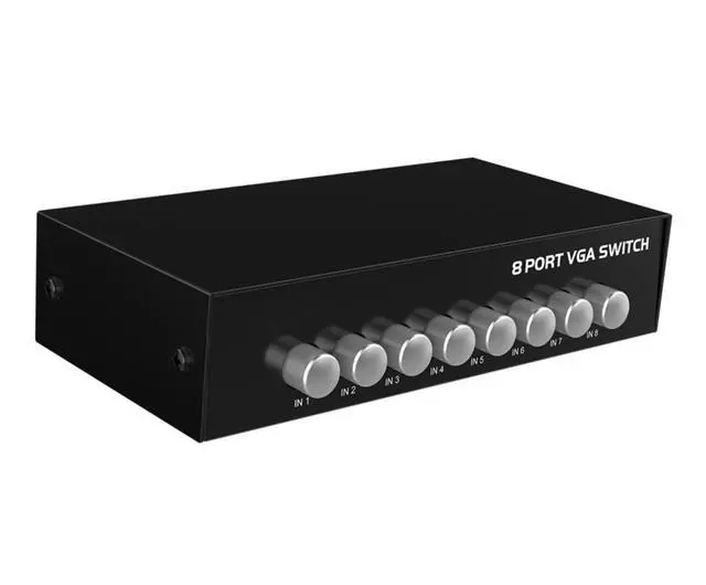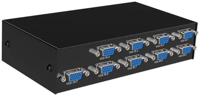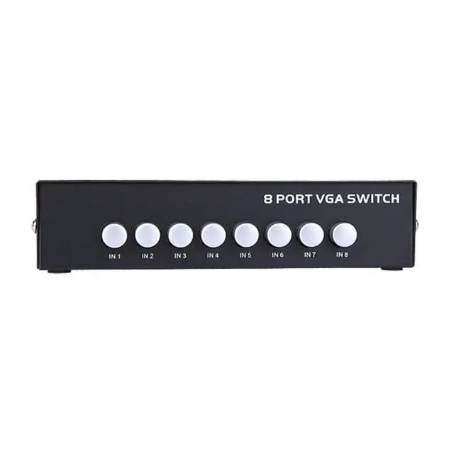 Brand Suckoo 8 port VGA video switcher 8 in 1 out 4 in 1 out bi directional inter convertible video sharer Computer host external VGA TV monitor projector selector switch box 1 host at a time Black. This VGA video switcher 8 in 1 out is a very practical device, it has 8 into 1 out interface, you can access the VGA signal source in the 8 port VGA input switcher, such as computer host DVD player external 1 monitor TV projector and other equipment. 1 time 1 host display. It can also be a computer host, external 8 monitors, switching monitors for individual use.