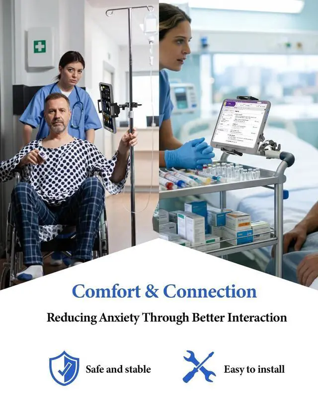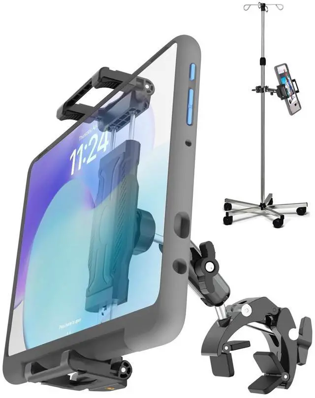 Whether it's for EHR charting at the bedside, patient education, or telehealth video calls, this mount ensures optimal viewing. Perfect for EMR/EHR charting, patient engagement, and bedside entertainment, it significantly enhances efficiency and comfort for healthcare providers and patients. ^^ [Extra-Deep Clamp for Thick Cases] Designed for rugged protection. The 1.18" deep clamp securely holds tablets with thick or rugged cases. Compatible with 6" 15.6" devices including iPad Pro 12.9 /11, Air, Mini, Galaxy Tab, and smartphones. ^^ [Medical-Grade Tablet Mount] Engineered for patient viewing and clinical workflows alike, this IV pole tablet mount installs securely without interfering with IV lines, bed rails, or mobility aids.