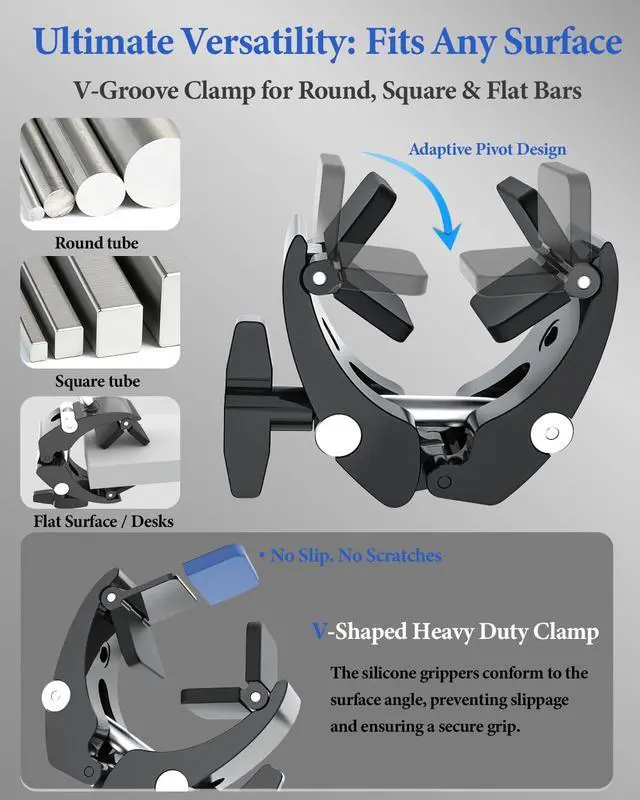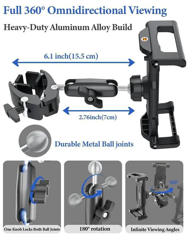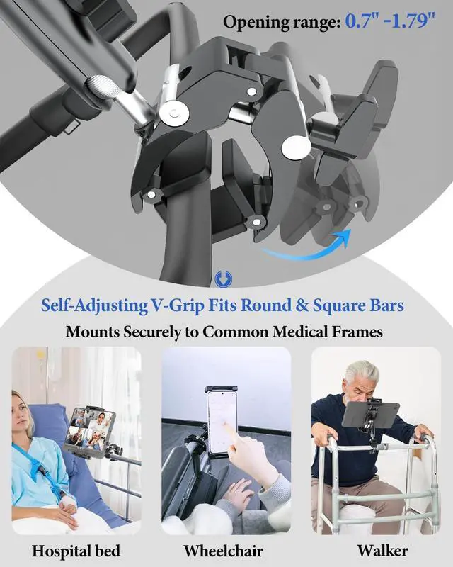 [Adjustable Aluminum Arm] Engineered with a heavy-duty 2.76" (7cm) adjustable aluminum arm, this Hospital Bed Tablet Holder offers up to 6.1" ( 15.5 cm) of rock-solid, shake-free height. ^^ [Universal Clamp for Square & Round Tubes] This heavy-duty clamp secures firmly to both round and square frames ranging from 0.7" to 1.79". Ideal for hospital bed rails, IV poles, wheelchairs, walkers, and medical carts. Dual-sided V-shaped anti-slip rubber padding ensures maximum surface contact and a stable, secure hold. ^^ [Ultra-Adjustable Viewing Angles] Reinforced metal ball joints support full 360 rotation, allowing seamless switching between portrait and landscape modes.