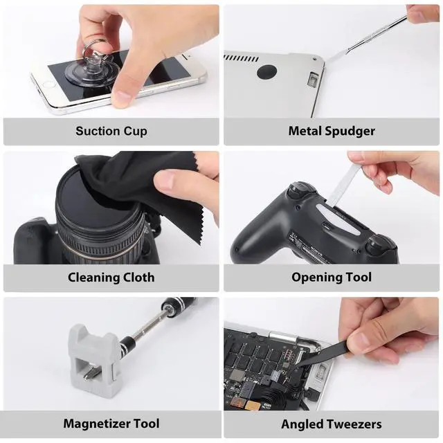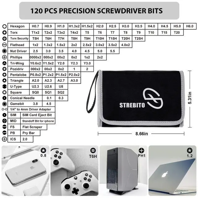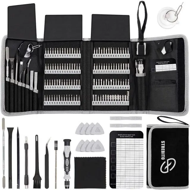 Wide ApplicationSTREBITO precision screwdriver set has 120 bits, complete with every driver bit you'll need to tackle any fix or DIY project. In addition, this PC tool kit comes with 22 accessories, such as magnetizer, magnetic mat, suction cup, spudger, cleaning brush, tweezers, etc. Whether you're a professional technician or a amateur, this essential electronics toolkit has what you need to repair all PC, iphone, laptop, PS5, switch, game controller, tablets, glasses, watch, etc ^^ Humanized DesignOur iphone repair tool kit has been designed with the professional in mind to maximize your repair capabilities.