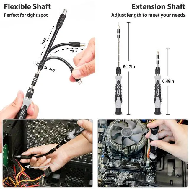 The screwdriver features a rubberized, ergonomic handle with swivel top, provides a comfort grip and smoothly spinning. Magnetic bit holder transmits magnetism through the bit, helping you handle small screws and parts. The blade can be extended for working in hard-to-reach areas. And flexible extension shaft is useful for removing screw in tight spots ^^ Magnetic DesignWe put 2 magnetic tools in this computer repair tool kit that save your energy and time, make your fixing job easier. The 5.7 x 3.3" magnetic project mat can keep all tiny screws and parts organized, prevent from losing and messing up, make your repair work more efficient.