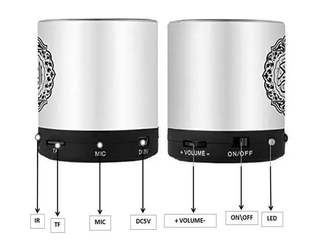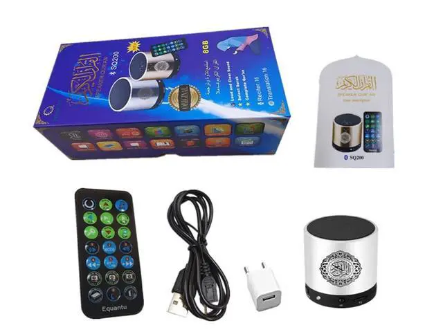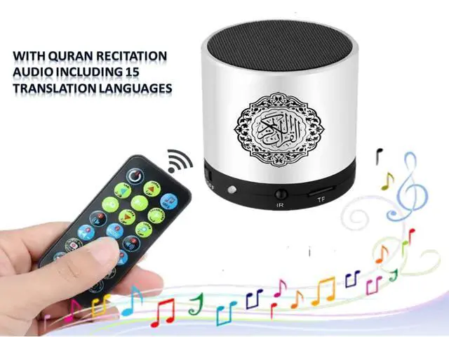 Characteristic: * Quran speaker with remote control HD Quality Reciting (18 votes). * Quran translate audio (15 languages). * Press the button on the remote control to play the Qur'an Surlan. * Quran speaker Support MP3 function. * Quran speaker Support recording. * Quran speaker Support TF card slot extension.