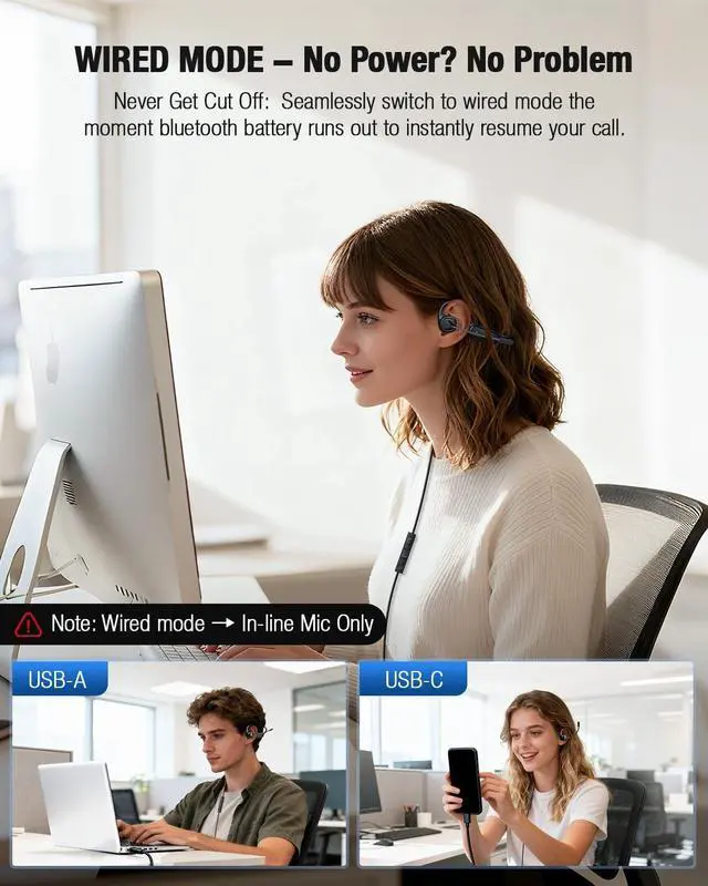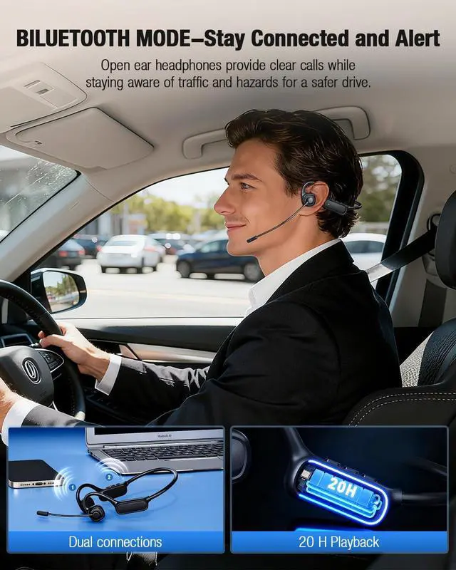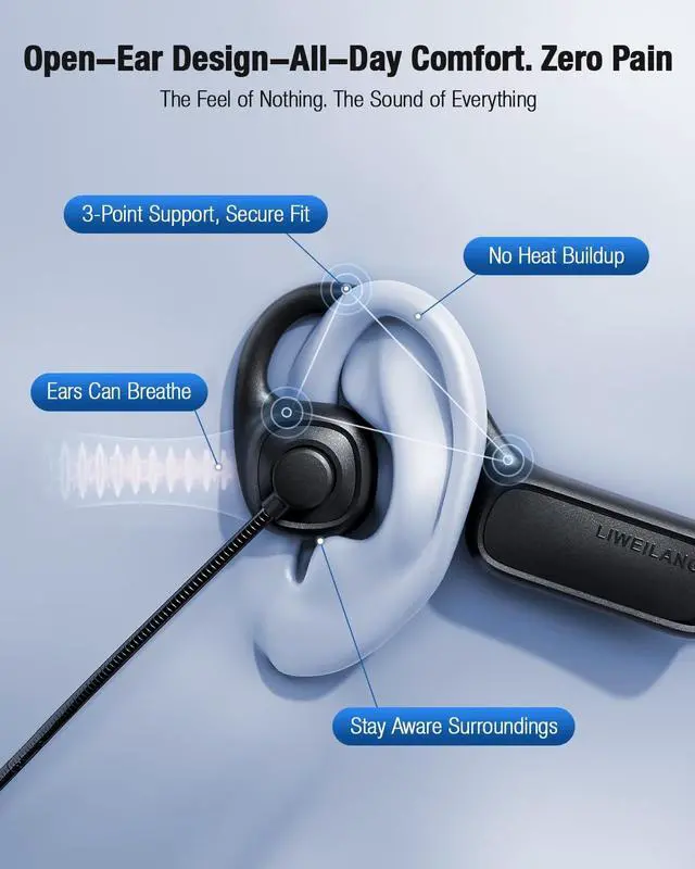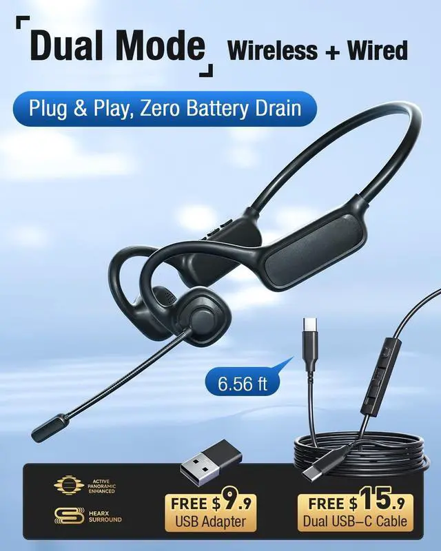 Dual-Mode Connectivity: Wireless headphones & Wired headset Freedom Experience the best of both worlds. Enjoy the latest bluetooth 5.4 headphones for stable, cord-free listening, and use the included USB-C to USB-C cable & USB-C to USB-A adapter for a instant wired connection. This innovative dual-mode design solves common Bluetooth pain pointslike sudden battery drain or connection dropsby giving you a reliable wired backup instantly. Stay connected to any device, whether it has Bluetooth, USB-C, or classic USB-A ports. ^^ Open-Ear Design for All-Day Comfort & SafetyOur open ear headphones eliminate the discomfort and unhygienic feeling of traditional in-ear buds. Weighing only 1.23O z, they are incredibly lightweight for a burden-free experience, even when worn all day. The open design keeps you aware of your surroundings, significantly enhancing safety during activities like driving, commuting, or outdoor running. ^^ Immersive Hi-Fi Sound & 16.2 mm Large DriverImmerse yourself in superior audio quality. Equipped with a high-fidelity stereo speaker and a large 16.2 mm driver coil, our bluetooth headphones deliver richer bass, clearer treble, and a more expansive soundstage than standard open-ear headphones.