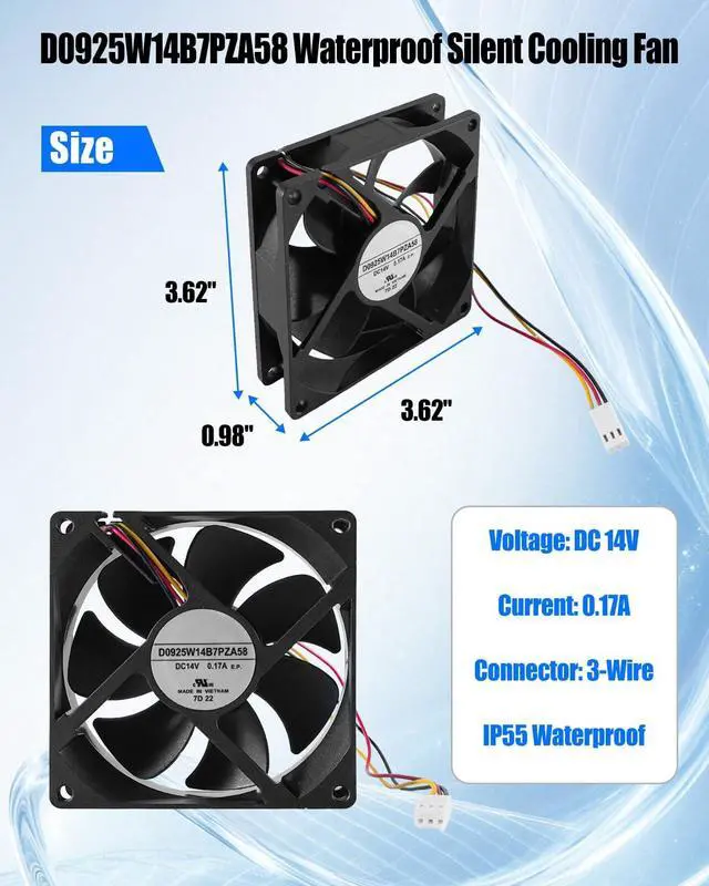 : D0925W14B7PZA58 Cooling Fan measures 929225mm and operates at DC 14V 0.17A, 3-wire IP55 waterproof fan delivers efficient and quiet cooling for CPUs, electronic devices, and other heat-sensitive components ^^