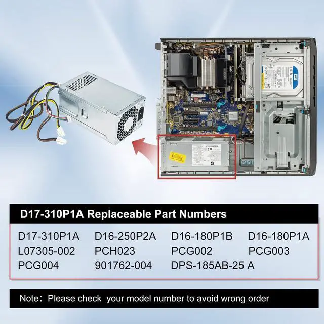 D17-310P1A Replaceable Part Numbers L07305-002, PCH023, PCG002, PCG003, PCG004, 901762-004, DPS-185AB-25 A, DPS-180AB-25 A D17-310P1A, D16-250P2A, D16-180P1B, D16-180P1A power supply. ^^ L07305-002 310W Power Supply Compatibility L07305-002 310w power supply replaces hp 310W power supply compatible with HP 280 G3 288 G3 480 G3 600 G3 880 G3 HP 280 G4 288 G4 480 G4 600 G4 880 G4 power supply and HP Z2 G4 SFF Workstation power supply. ^^