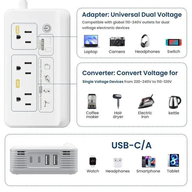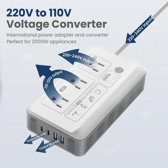 Voltage Converter: This 220v to 110v Converter is with 3 AC sockets, 2 USB-A ports and 2 USB-C ports. The converter is designed specially for high-power appliances from 25W up to 2000W, providing safe and stable voltage conversion for devices such as hair dryers, coffee makers, kettles, electric irons, and etc. ^^ 300W Adapter and
