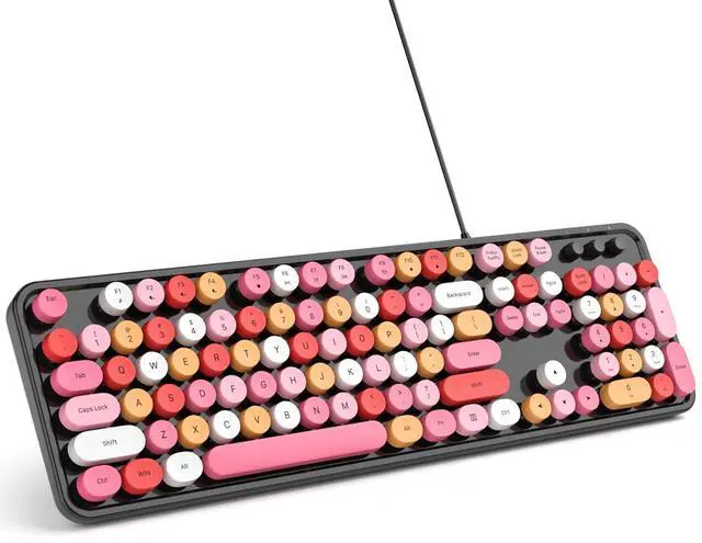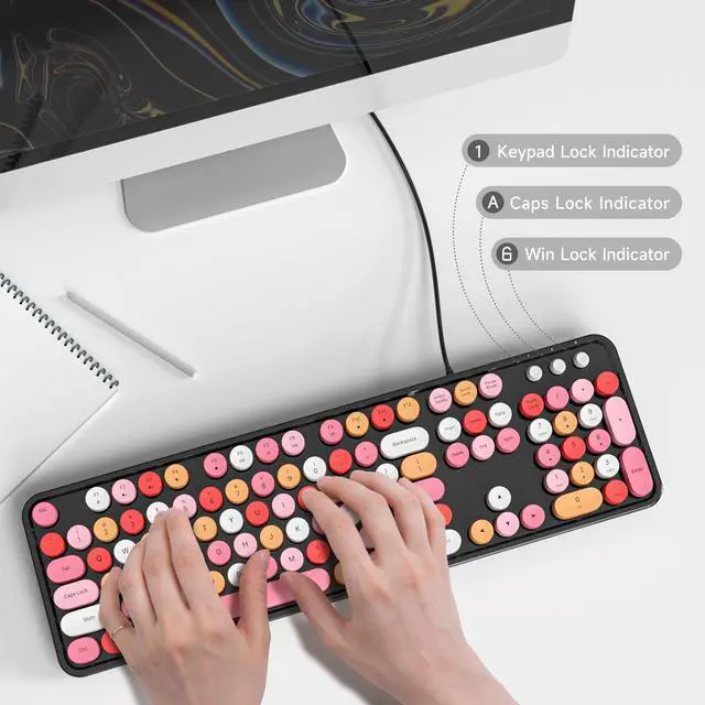 MOWUX Computer Keyboard Wired, Plug and Play USB Retro Round Typewriter Keyboard, Full Size Wired Keyboard with Foldable Stands for Laptop and Office PC- Black Colorful