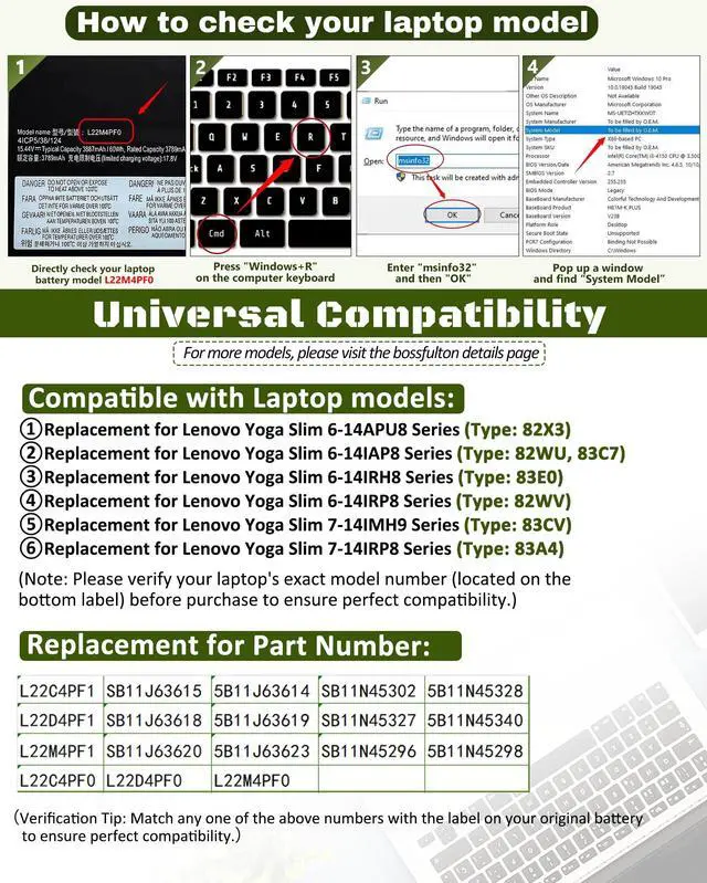 Note: Please be advised that the standard return window on closes after 30 days. If you encounter any issue with your battery, please contact us directly by visiting the "Your Orders" section and selecting the "Contact Seller" option for prompt assistance. ^^ Durable & Safe & ReliableEvery our products replacement battery is engineered for durability, safety, and reliability. Backed by UL, CE, FCC, and RoHS certifications, they meet the highest standards for performance and environmental safety. Our confidence stems from stringent compatibility testing and rigorous quality control throughout production. ^^ Model VerificationTo ensure a perfect fit, please open your laptop's back case and verify the exact model number printed on your original battery before placing your order. This is the most reliable way to guarantee compatibility. ^^ Pre-Installation GuideBefore installation, carefully read the provided user manual to ensure a safe, correct, and successful battery replacement process.