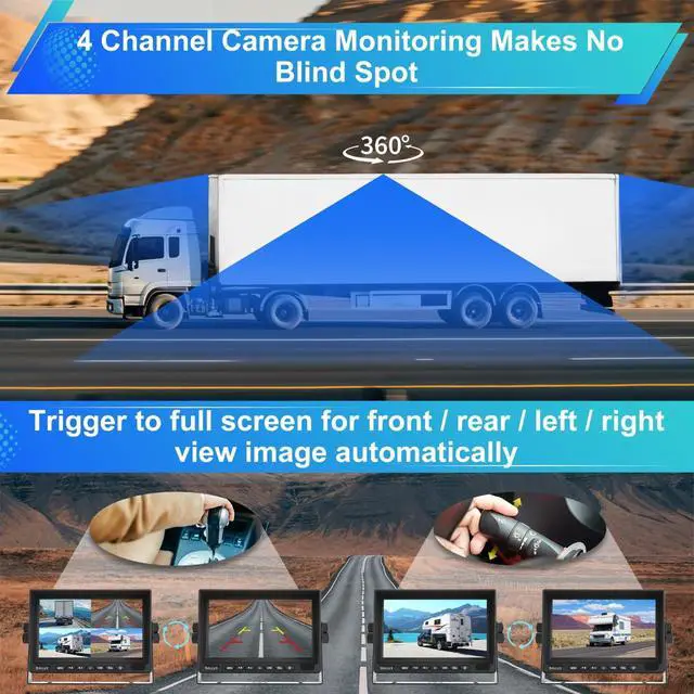 Widely CompatibilityThis backup camera system supported 12-24V power input. Can be wired for backup (reverse) or constant power. The best choices of backup camera system for RV, Trailer, Truck, Camper, Van, Motorhome, 5th wheel, Tractor, Pickup, Semi Truck, School Bus, Cargo Van. ^^ 360 Full View ImageIt comes with 7 inch IPS panel all viewing angle screen, this monitor can split to Full/Dual/Three/Quad screen, mirror image and rotate image. 360 degree viewing to avoid blind spot, makes it more convenient and safety for driving.