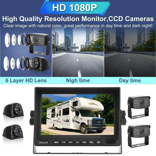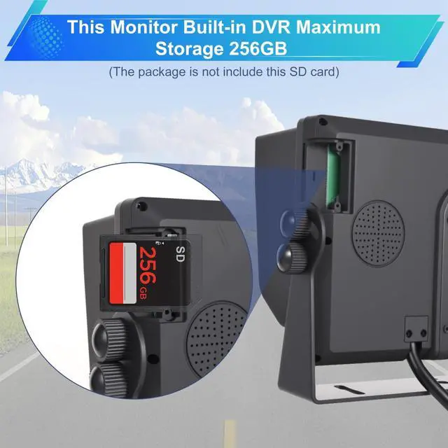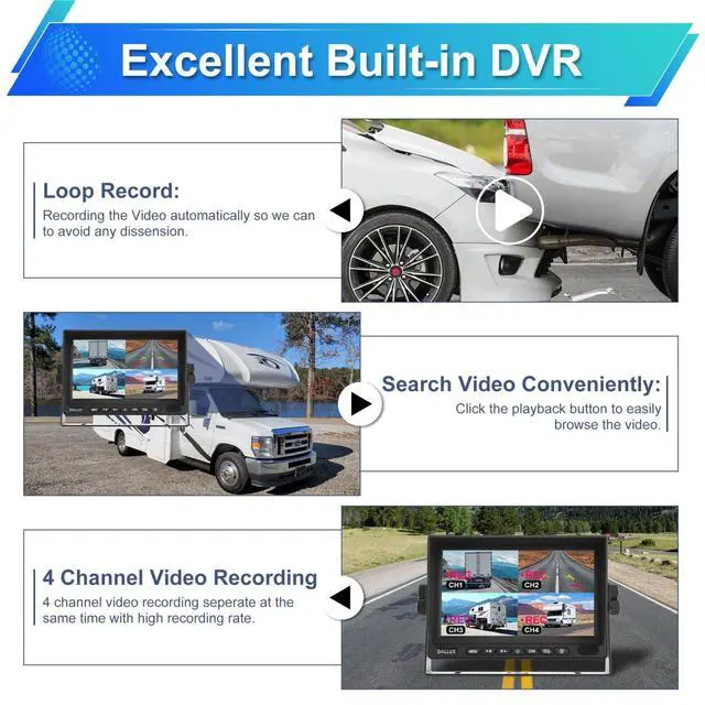 ^^ Powerful Recording Built-in DVR monitor, it supports record 4 channels camera at the same time and loop recording. The storage capacity can up to 256GB, saving the video automatically just in case, so we can find the video easily if we need. ARM DSPS High speed processor give you a better vision experience. Built-in Linux operating system help us to operate more conveniently. ^^ Excellent backup cameraRear/front view and side view IR night vision camera with high definition 1080P 1/3" CCD image sensor, 6 layer glasses HD lens, 145 degree wide viewing angle, IP69K waterproof camera can withstand -68F~176F extreme temperature and work well even in heavy rain or other bad weather condition.
