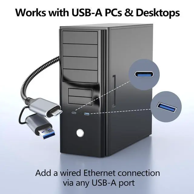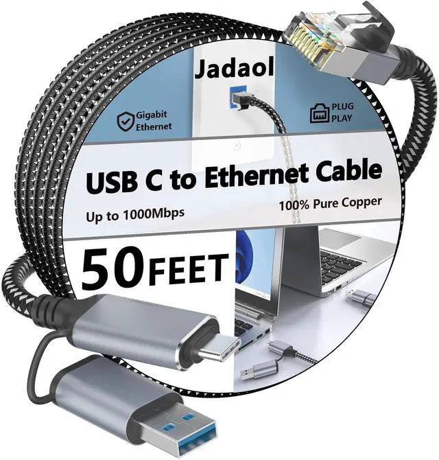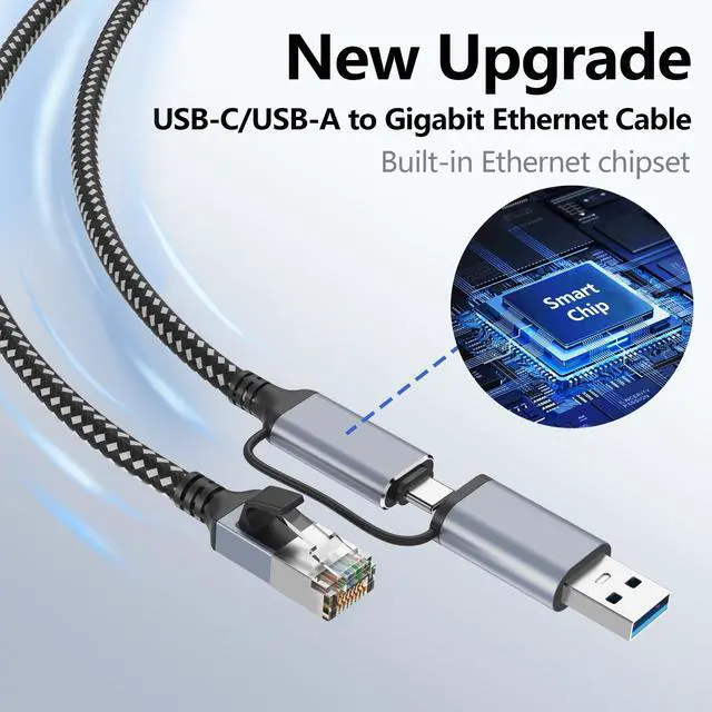 USB-C & USB-A Dual Connector USB-C plug with a built-in USB-A adapter works with USB-C devices and USB-A PCs/desktopsno separate dongle to carry. ^^ Up to 1Gbps Gigabit Ethernet Supports 10/100/1000 Mbps networks for a stable wired connectiongreat for gaming, streaming, video calls and downloads. Actual speed depends on device and network. ^^ Easy Setup Connect the USB end to your device and the RJ45 end to a router/modem/switch for wired internet. Driver may be required on some systems. ^^ Durable, Reliable Build Pure copper conductors, aluminum housing, reinforced strain relief and a nylon-braided jacket help resist bending and daily wear.
