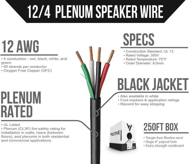 12AWG, 4 CONDUCTORS, BLACK JACKET, 250FT BOX. 12 gauge speaker cable, featuring 65 strand Oxygen-Free Copper conductors. Built to exacting standards with zero compromises. ^^ OXYGEN-FREE COPPER. Oxygen-free copper (OFC) conductors result in less signal loss and are more durable than conductors made of copper-clad aluminum (CCA). ^^ CL3P RATED. Plenum (CL3P) fire safety rating for installation in walls, risers (between floors), and plenums in both residential and commercial applications. UL Listed. ^^ TIME SAVING FEATURES. Patented winding technology & massive payout hole eliminate kinks and tangles.