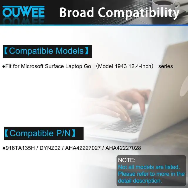 Replacement for Part Number: 916TA135H / DYNZ02 / AHA42227027 / AHA422270289. Compatible Models (use "Ctrl+F to find your model quickly")Fit for Microsoft Surface Laptop Go Model 1943 12.4 -Inch series. Not all models are listed, please check the part number of your original battery. 10.