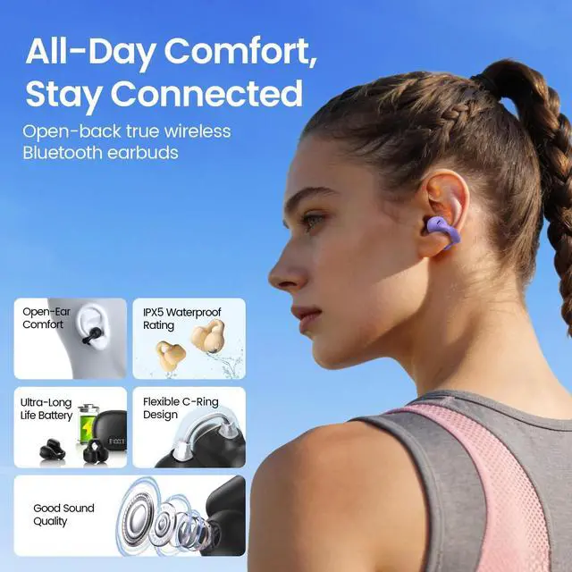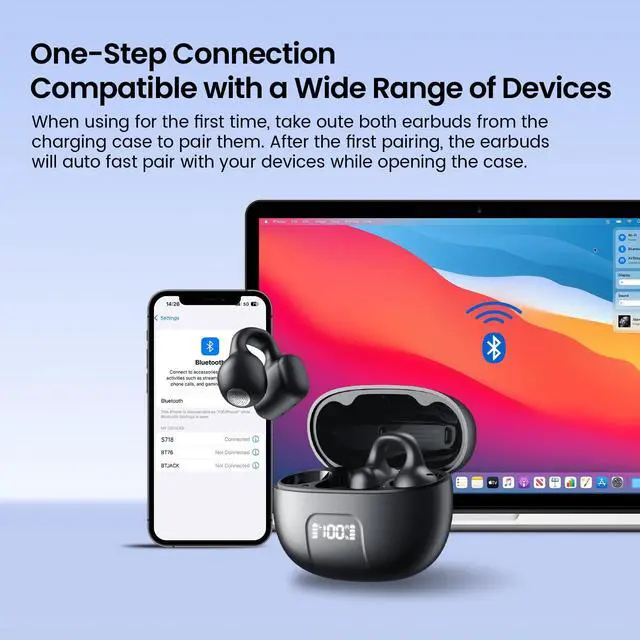 All-Day Wear: More comfortable to wear. Mini body, new design style, suitable for binaural use, very lightweight, and ear firmly fit, can be worn for a long time, will not feel discomfort. completely open design, the earbuds can be gently and firmly placed on the top of the ear. Open ear earbuds are typically lighter and more breathable than in-ear headphones, making them more comfortable to wear for extended periods of time.