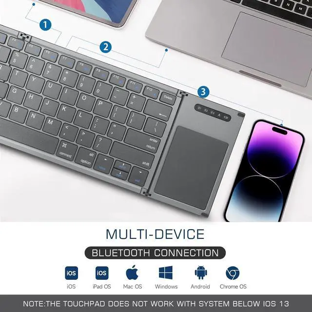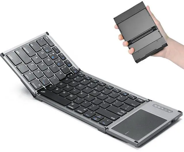 : Featuring a full-size with a sensitive surface( 2.15 * 2.90 inch) 20% larger than previous models. Fully supporting left and right mouse button functions. The makes typing more comfortable, quiet, and precise. Perfect gift for travel and business trips! ^^: Dark gray matte exterior, made of durable ABS+PC material, lightweight but sturdy, without fear of daily wear and scratches. It can be easily folded up and carried around, making it suitable for people who frequently travel or work in different locations....... )