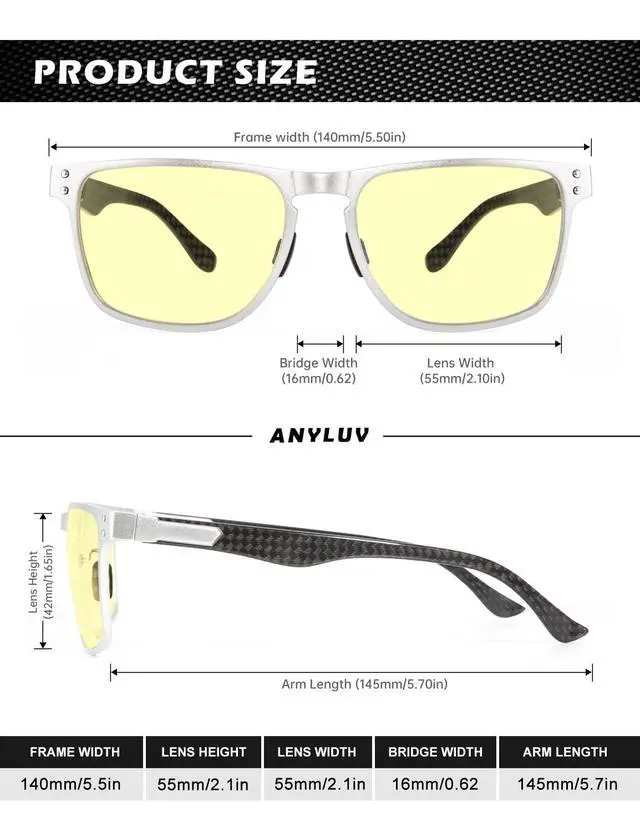 • Modern Carbon Fiber Material ANYLUV blue light glasses men feature lightweight material,offer maximum comfort and durability, allowing to wear them for extended periods without any discomfort. Compared with pure metal frames blue ray glasses, carbon fiber blue light filter glasses provide better high tensile strength, low weight, high temperature tolerance. Don't settle for less when it comes to your eyes try our premium anti blue light glasses and elevate your visual experience.