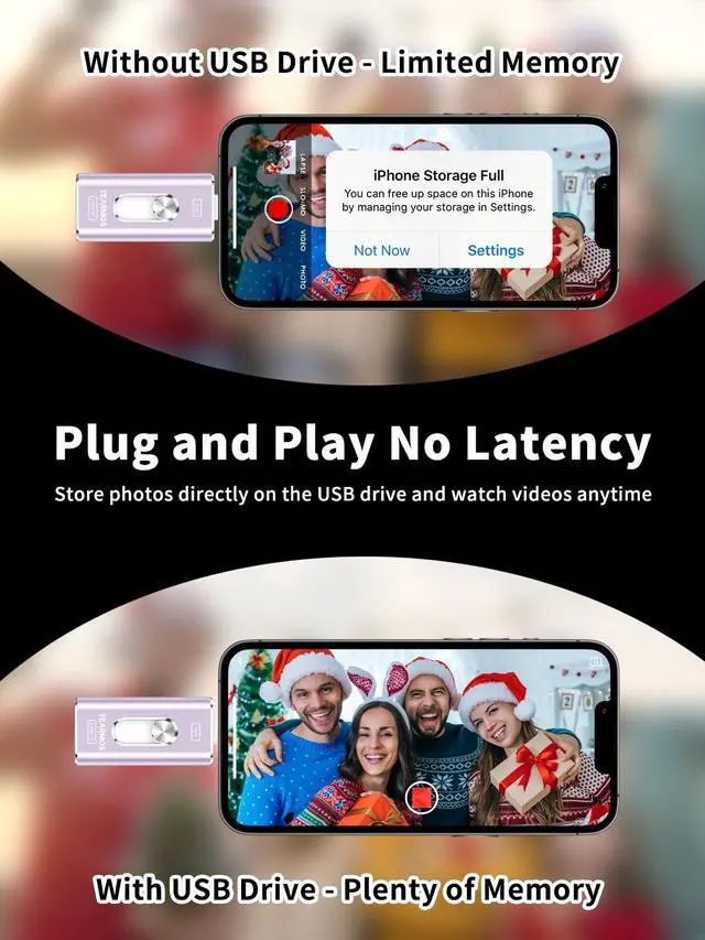 (Note: Requires iOS 13 or higher for iPhone; Android devices must support OTG) ^^ Blazing Fast Transfer SpeedsTransfer photos, videos, and files in a flash! With read speeds up to 30 MB/s and write speeds up to 15 MB/s, our USB stick outperforms standard drives. Edit on the go without buffering or lag, and enjoy a smoother workflow. Lets you effortlessly backup and organize photos, and videos from your phone straight to the phone storage photo stick, freeing up valuable device space.