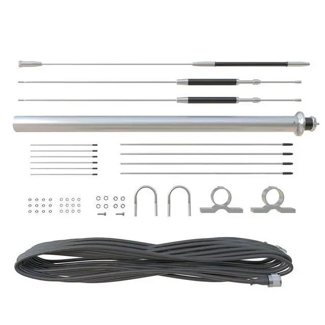 ^^ Durable Taiwan-Made Construction Stainless steel elements resist corrosion; standard SO-239 connector allows fast deployment. Includes 10 m RG-58 coax extension cable.