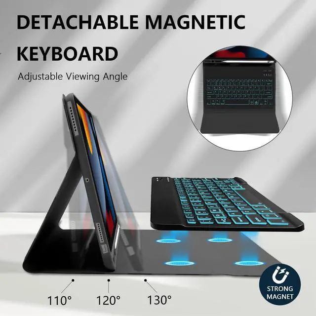 Number: A1701/A1709/A1852) It is Not compatible with any other models. Please check the model number starting with "A" on the back of your iPad before purchasing ^^ [LED Backlit Keyboard] 2 light modes (Monochromatic and gradient light), three-level adjustable brightness and 7 pure led backlit, engaging yourself in a free and relaxed typing experience in any dim condition. The backlight will automatically turn off if you are not typing for over 30 sec to save power ^^ [ Rechargeable and Long Life Battery ] Our case with keyboard built-in 420mAh large capacity battery, is more energy saving and lower consumption, ensure you can use at least 230 hours. Enters into sleep mode automatically if not in use for 15 minutes. It can be fully charged in 2 hours with Type-C charging cable, don't need to replace battery ^^ [ Magnetically Detachable Bluetooth Keyboard ] Our case with keyboard is magnetic so it can be easily repositioned or removed from the case. Equipped with useful shortcut keys and compatible with IOS, Windows, and Android systems, provide you with ultimate convenience ^^ [ Adjustable Viewing Angles As Needed ] Our case with keyboard supports multiple viewing angles adjustments.