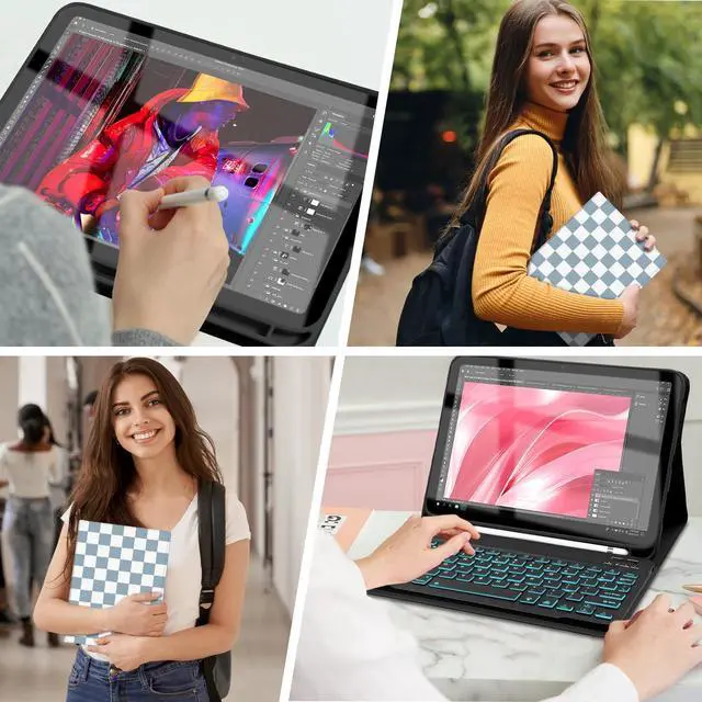 NOTE: Stylus is not included ^^ [ Premium Material ] Our case with keyboard is made of good quality PU material. Soft, durable and it gives a luxurious feeling. A lovely colorful plaid pattern to cheer up the mood! The interior case is made of premium flexible TPU, honeycomb grid pattern design is better for heat release. Precise cutout allows full access to all ports, sensors, speakers, microphone and camera ^^ [ Mewealth SUPPORT ] If you have any questions, please feel free to contact us via message, we will help you at any time. Your satisfaction is our priority. Package including 1 x case, 1 x LED wireless keyboard, 1 x Type-C charging cable, 1 x user manual. Please kindly note iPad and pencil are NOT included
