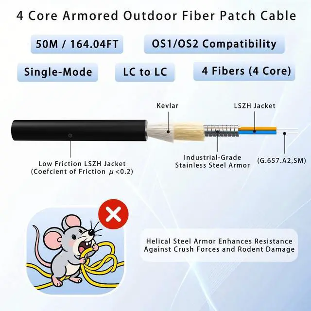 Key Features: 4 Core OS2 G. 657. A2 Fiber Built for Speed and Long-Distance TransmissionUtilizing bend-insensitive G. 657. A2 grade OS2 fiber, this LC to LC patch cable delivers low-loss, high-performance transmission across 1310nm and 1550nm wavelengths. It supports data rates up to 100Gbps with insertion loss 0.15 dB and return loss 55dB. Dual-Layer Industrial ArmoringBuilt with stainless steel woven mesh and metal spiral armor reinforced by fiberglass yarns, the cable withstands crush forces up to 3000N and tensile stress up to 600N. This robust design ensures protection against rodent bites, impact, and physical wear. Rugged TPU Jacket Engineered for Harsh EnvironmentsThe 5.0 mm TPU outer jacket offers outstanding resistance to water, UV rays, high/low temperatures (-40C to +80C), abrasion, and chemicals. Suitable for direct burial, conduit, or aerial installation across extreme outdoor environments. Pre-Terminated LC UPC to LC UPC Plug and PlayNo splicing or polishing requiredjust connect and go. The 4-fiber breakout design with 3.0 mm leg diameter allows easy routing and quick deployment in time-sensitive installations.