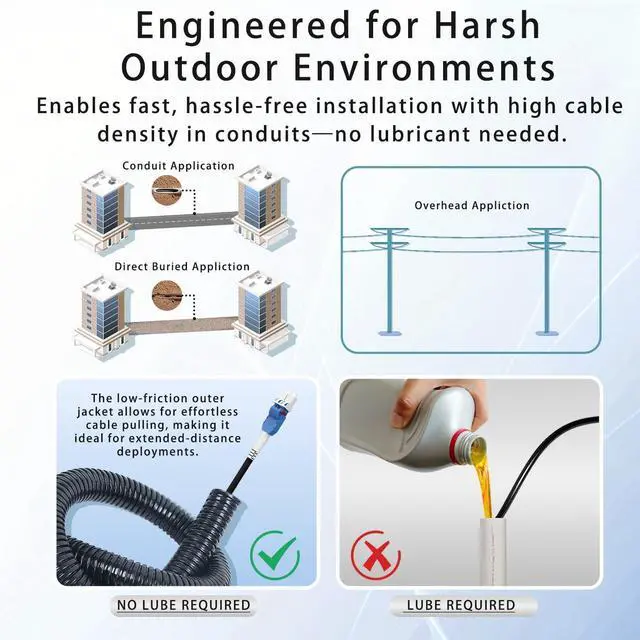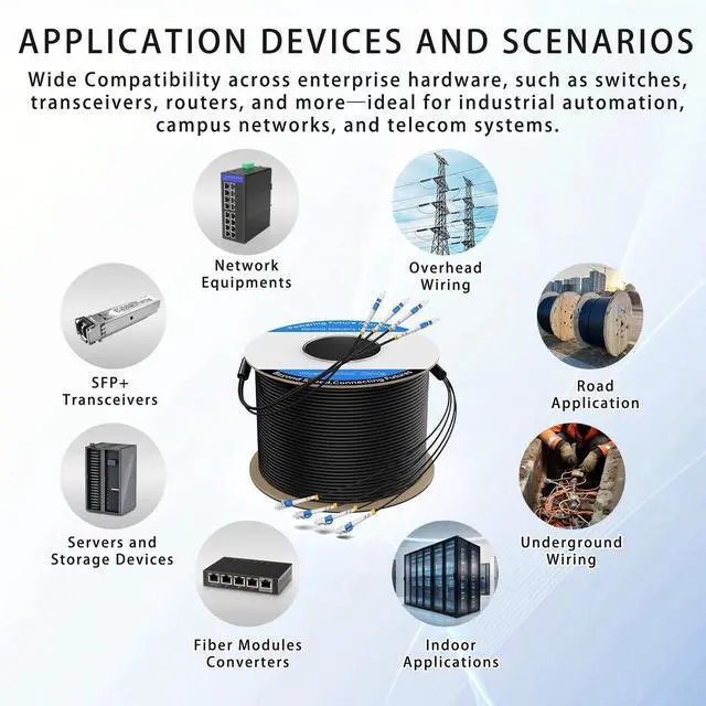 Fiber Count: 4 Simplex Fibers, Can be used as four individual simplex links, or combined into two duplex pairs for bidirectional communication. Versatile Applications Indoor/Outdoor and Industrial GradeSupports overhead deployment, underground installation, or conduit runs for versatile infrastructure layouts.