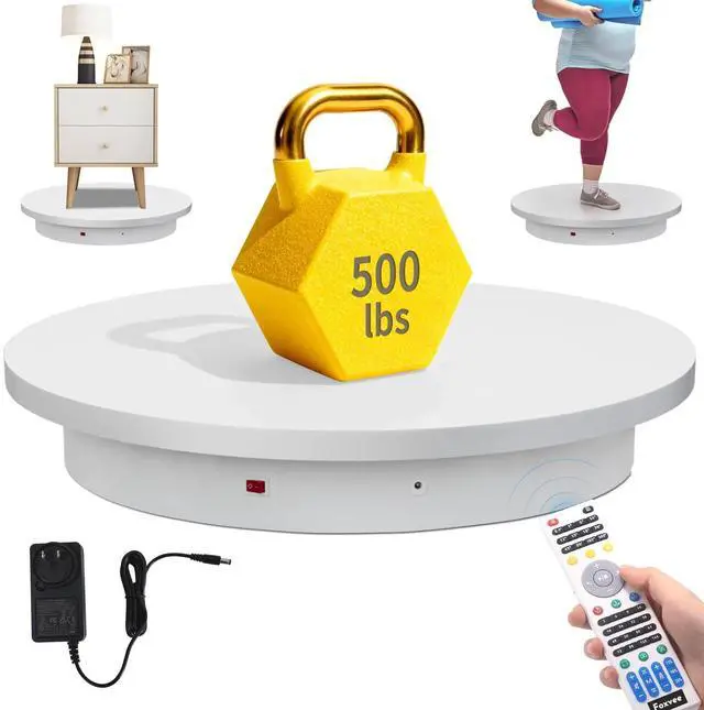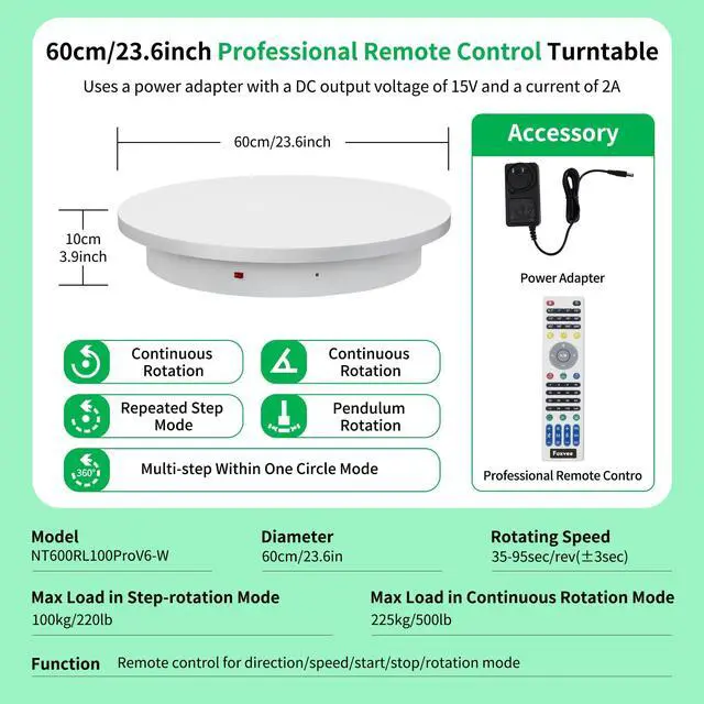 Rotation Mode: 225kg/500lb max load (No angular positioning required) for this Remote-Controlled Motorized Turntable& heavy-duty Rotating Platform.