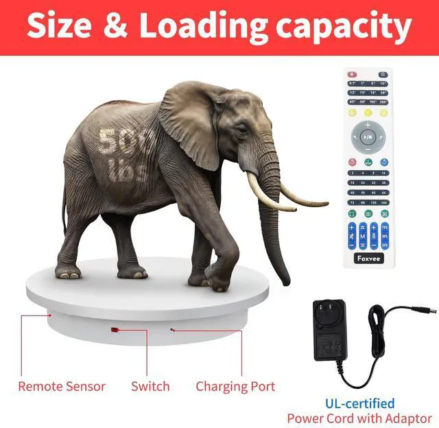Output: DC 15V/2A (US Standard Plug). UL-certified power adapter. The high-performance Remote-Controlled Electric Turntable has passed US FCC, EU CE and ROHS certification as a safe Spinning Display Platform.