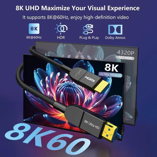 8K HDMI 2.1 CableThis HDMI Cable 100ft meets the latest standard HDMI 2.1 Version, backward compatible with HDMI 2.0 / 1.4 / 1.2 / 1.1, 8K fiber optic hdmi cable supports 8K@60Hz, 4K@120Hz, and 2K@240Hz, along with Dynamic HDR, Dolby Atmos, eARC, VRR, ALLM, and QFT, HDCP 2.2 & 2.3, Unlock 7680x4320 resolution with 12-bit color depth ^^ Fiber Optic HDMI Cable Engineered with most advanced fiber optic technology for superior lightweight, ensures ultra-fast data transmission, less signal attenuation, better interference immunity, and 10x longer lifespan than copper cables.