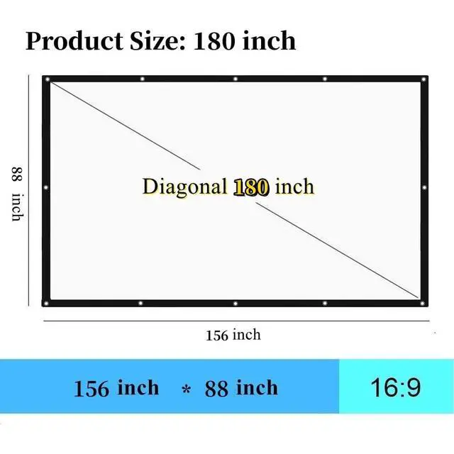 1.16: 9 Screen Format and Diagonal 180", Offering 156 x 88 Viewing Area. 2.180 inch 16:9 Portable Projection Screen, Perfect for Handheld Projectors. 3. High Brightness, White Screen Material is Extremely Sturdy4. Compact One-Piece, Lightweight and Folding Design, Easy to Carry5. Easy to Install and Hang, Both Indoors and Outdoors6. Suitable for Home theater, Business meetings, Exhibitions, Conventions, Outdoor Picnic, Presentations, etc.