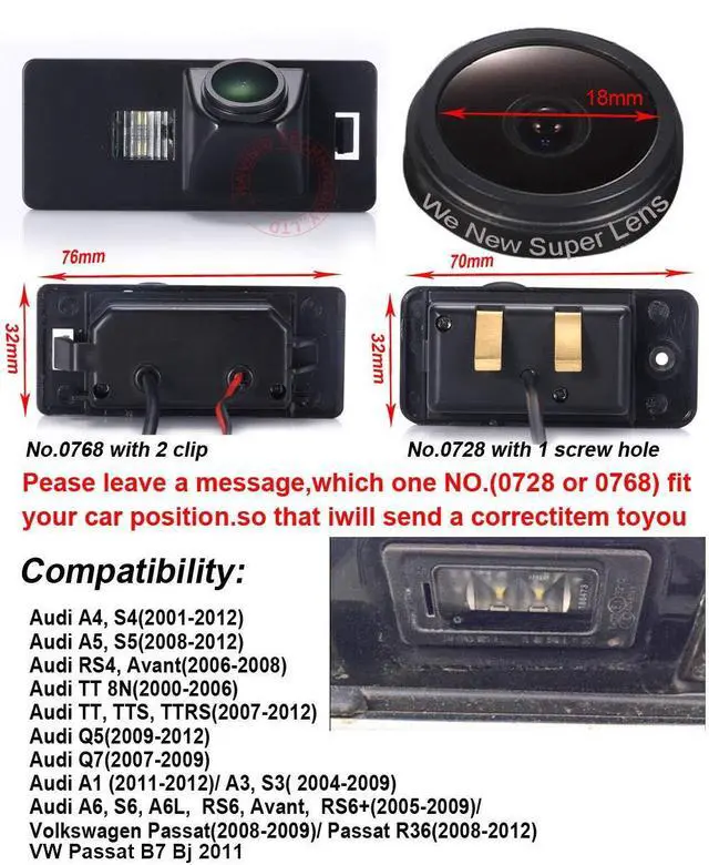 Dear customer, Please must check the camera size and appearance before place a order, see if can fit your car license plate lamp place size and appearance! Because the same car model in different countries may have some difference, please check the camera size and compare the installation of your car carefully to avoid mistake. This product could fit for all below models as expected: For Audi A4, S4(2001-2012); Audi A5, S5(2008-2012); Audi RS4, Avant(2006-2008); Audi TT 8N(2000-2006); Audi TT, TTS, TTRS(2007-2012); Audi 05(2009-2012); Audi Q7(2007-2009); Audi A1 (2011-2012)/A3, S3( 2004-2009); Audi A6, S6, A6L, RS6, Avant, RS6+(2005-2009); replacement for Volkswagen Passat(2008-2009)/ Passat R36(2008-2012)-