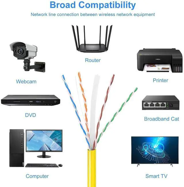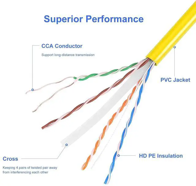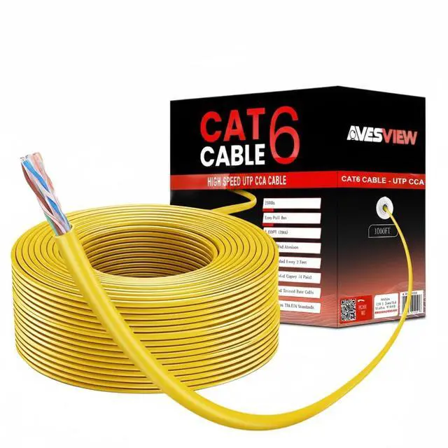 ^^ High-Visibility Yellow Jacket The bright yellow jacket makes the CAT6 Ethernet Cable 1000FT easy to identify in wiring closets, basements, and structured cabling systems. ^^ UTP Design for Indoor Installations Designed for low-EMI environments, this CAT6 1000FT cable performs best in residential and small office networking setups.