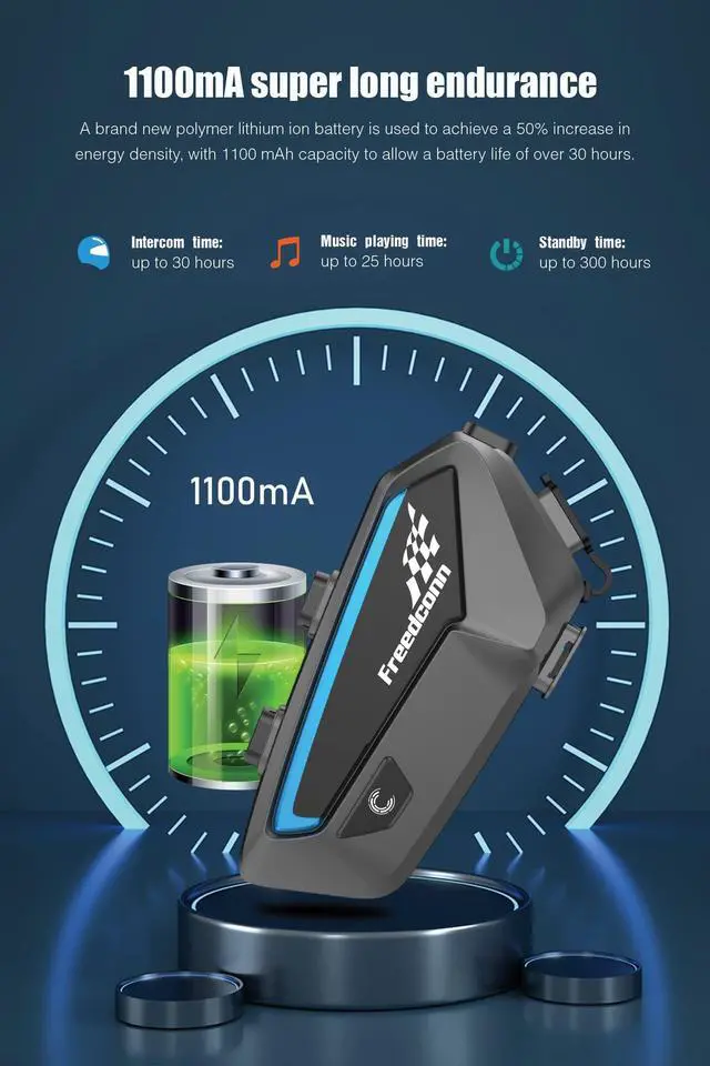 ^^ Long Standby & IP67 WaterproofThe motorcycle communication systems built-in 1100mAh high-capacity battery, the continuous talking time up to 30 hours, the music playing time up to 25 hours, and the standby time up to 300 hours. The motorcycle intercom with type C charging port, it can be fully charged in as little as 2 hours. The main body of the FreedConn FX intercomunicador para casco de moto is IP67 standard waterproof level, so dont worry about sudden rain while driving. ^^ Handsfree & FM & GPS NavigationThe voice assistant function of the phone can be activated through the motorcycle helmets bluetooth, free your hands and ensure driving safety (Brand Exclusive Technology).