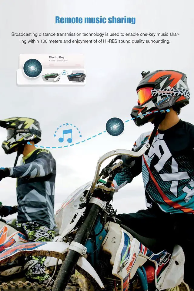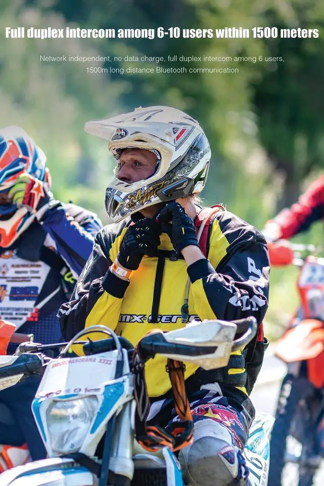 1500M Maximum Distance & Music SharingFX motorcycle helmet bluetooth is equipped with new 3 cores processor Qualcomm Bluetooth 5.0 chip, system super stable, and achieves high speed, low delay and low distortion. If there are no obstacles such as buildings in a straight line, the motorcycle intercom maximum group communication distance is about 1500 meters, all riders can speak with clear sound quality. It featured music sharing that allows two riders enjoy the same song during their trip. ^^ Support 10 Riders Group Intercom & Dual Noise ReductionFull duplex intercom for group helmet bluetooth headset within 1500 meters, Network independent, the motorcycle bluetooth headset supports multiple people simultaneous call.