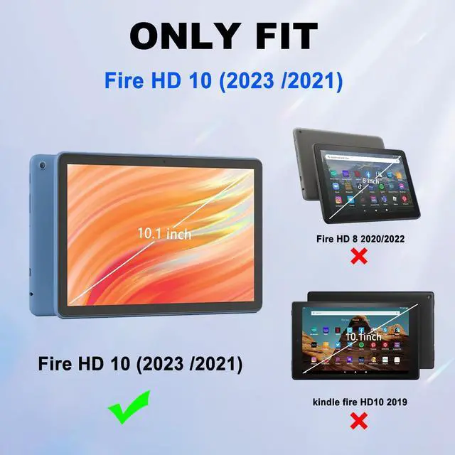 APPLICABLE SCOPEIt's only suitable for Fire HD 10 Tablet 13th Generation 2023/Fire HD 10 2021 11th Release, With stand/Pen Loop HolderNOT Fit Any Other Devices. Please check the model on the bottom of the back of the tablet before ordering ^^ FUNCTIONThe non-skid design allows tablet to stand at angle in landscape orientation to make your hands free, Light and durable protective TPU shell and fashion PU leather cover, soft non-scratch microfiber interior improves comfort and protection ^^ FASHION DESIGNThis for Fire HD 10.1 tablet case has Simple and fashionable style design which makes your table case looks distinctive, This Kindle Fire 10 cases and covers is a best choice for kids, children, girls, boys, family, women, man ^^