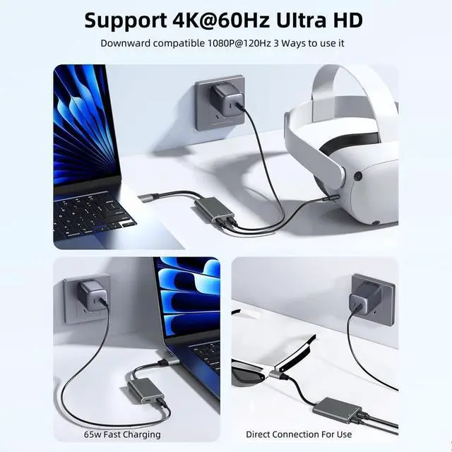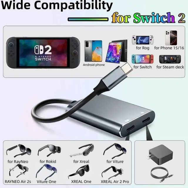 USB-C to glasses charging adapter that allows you to connect your device to AR glasses and charge them at the same time. Play while charging, you never have to worry about power problems. When using a handheld game console, such as Switch, a 45W or higher PD charger is required. Compatible with Switch 2