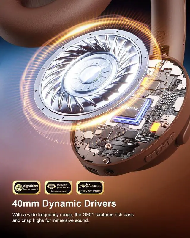 Deep Bass: Equipped with custom 40mm dynamic drivers, G901 over-ear headphones deliver High-quality audio with balanced deep bass and crisp highs. Whether wireless or wired (via 3.5 mm AUX), enjoy studio-quality sound with enhanced clarity and detail, perfect for music, movies, and gaming ^^ Ultra-Long 60-Hour Music Playtime & 40H