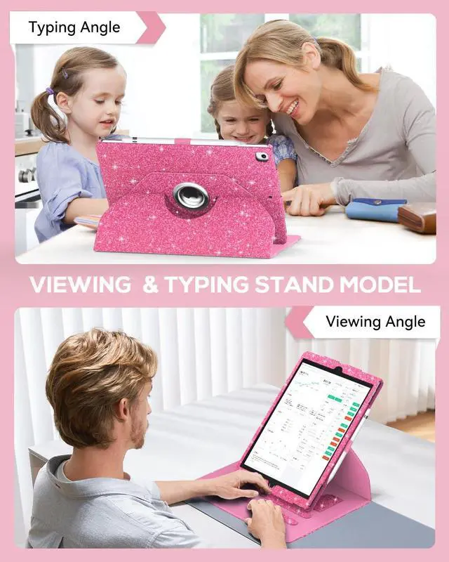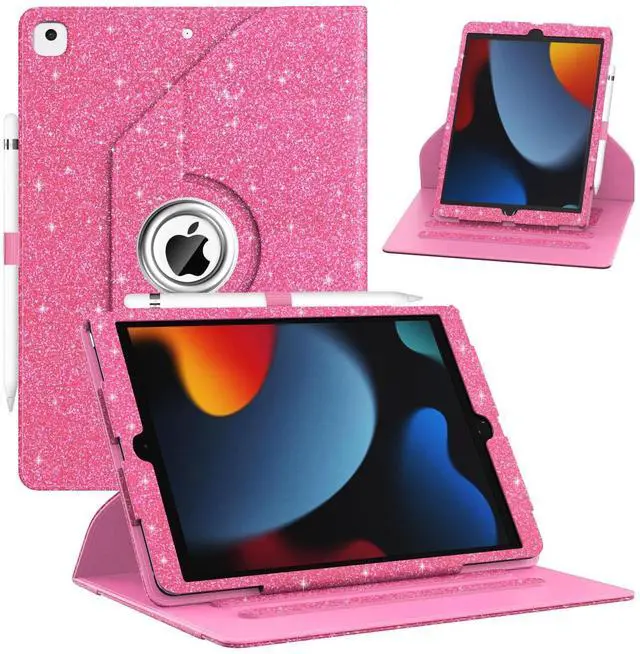 ZoneFoker Case for iPad 9th/ 8th/ 7th Generation, iPad 10.2 inch Case 2021/2020/2019, 360 Degree Rotating Stand, iPad 9 8 7 Gen 10.2'' Leather Cover with Pocket Design & Pencil Holder, Glitter Pink
