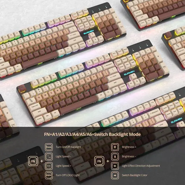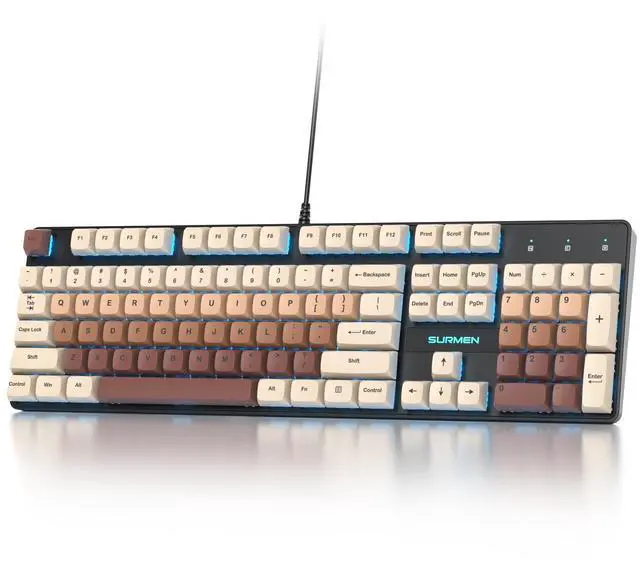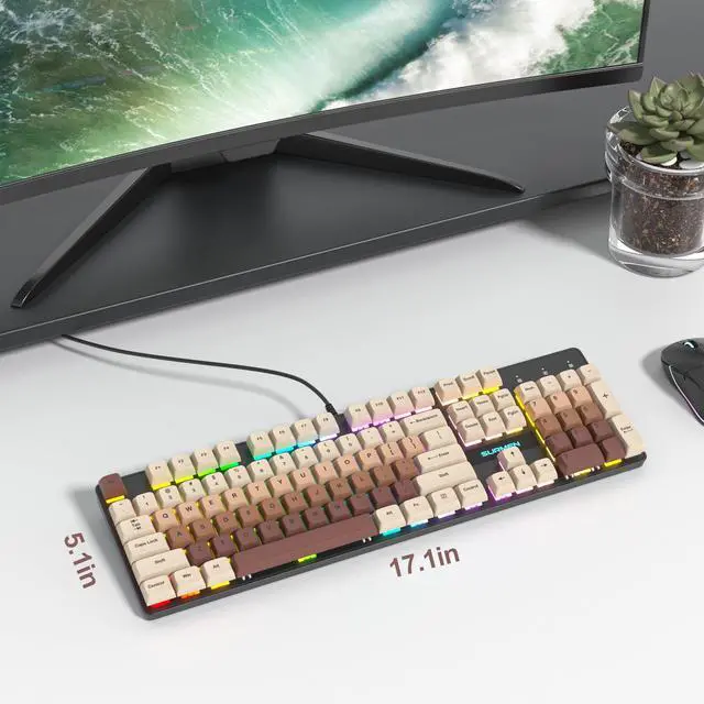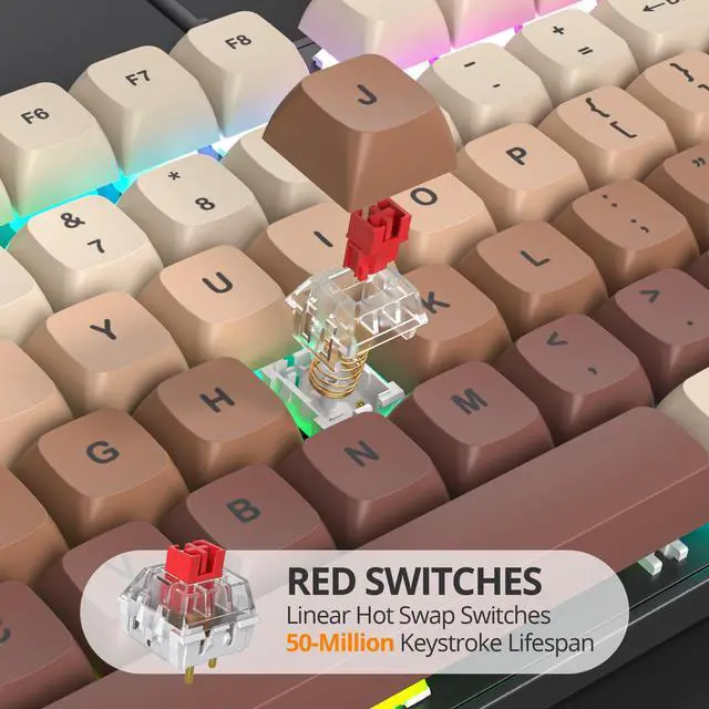 Vibrant RGB LightingThis full-size brown mechanical keyboard features vibrant RGB lighting effects that enhance your gaming experience with immersive colors, offering various dynamic backlighting modes for a lively gameplay atmosphere ^^ Smooth Linear Red SwitchesDesigned with linear red switches, this 104-key mechanical keyboard provides a smooth and quiet typing experience, making it ideal for both gaming and office work with accurate and consistent keystrokes ^^ Full-Size Creamy Keyboard with Number PadThis 104-key brown creamy mechanical keyboard includes a number pad for added productivity, making it a practical choice for data entry tasks and long gaming sessions ^^ Sturdy Build QualityBuilt from high-quality materials, this full-size mechanical keyboard is made for durability and can handle daily use and intense gaming sessions with ease ^^ N-Key Rollover and Anti-GhostingEquipped with N-Key Rollover and Anti-Ghosting features, this keyboard ensures every keypress is accurately registered, allowing for precise performance even with multiple keys pressed simultaneously ^^ Enhanced Gaming and Office PerformancePerfect for gaming and office work, this brown full Size mechanical keyboard features responsive linear red switches and a full-size layout for speed and accuracy, enhancing control and comfort for any task ^^ Plug and Play ConvenienceThis thocky keyboard offers plug and play convenience, allowing you to start gaming or working right away without complicated setup steps ^^ Ergonomic DesignCreated for comfort, this full-size mechanical keyboard features an ergonomic layout to reduce strain during long sessions, with well-positioned keys and a single-level adjustable foot stand for a comfortable typing angle ^^ PBT Dye-Sublimated KeycapsThis mechanical keyboard features durable PBT keycaps with dye-sublimation printing, ensuring long-lasting legends and a good typing experience with keycaps that retain their texture and clarity over extended use