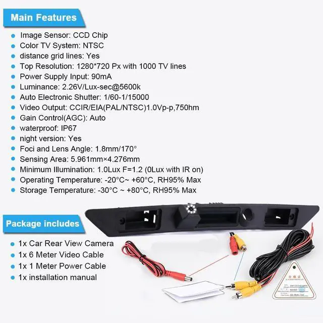 Package contents: 1 x reversing camera1 x power cable (1m) 1 x AV cable (6 m) 1 x user manual