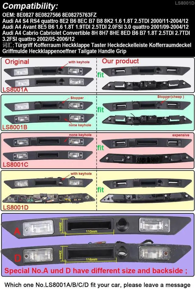 OEM: 8E0827657H 8E0827657D 8E0827657E 4E0827574K 4E0827574M3FZ4E0827574H3FZ 4E0827574K3FZ 8P08275743FZ 4L0827574 8E0827 8E0827566 8E08275763FZ; Compatible with Audi A3 Cabriolet Quattro 8P 8P7 S Line Convertible 2008/09-2013/05; Compatible with Audi A3 8V 8P 8P1 8PA S3 V6 Allroad Sportback Quattro Avant Facelift cabrio 2004-2013; Compatible with Audi A4 Avant 8E2 B6 8EC 8E5 B7 2000-2008; Compatible with Audi A4/S5 Quattro 2001-2008; Compatible with Audi A4 Limo B6 8E2 8E5 sedan 2001-2005; Compatible with Audi A4 B6 B7 8EC Avant 2005-2008; Compatible with Audi A4 S4 RS4 quattro 8E2 B6 8EC B7 B8 8K2 1.61. 8T 2.5TDI 2000-2004; Compatible with Audi A4 Avant 8E5 B 61.61. 8T 1.9TDI 2.5TDI 2.0FSI 3.0 quattro 2001-2004; Compatible with Audi A4 Cabrio Cabriolet Convertible 8H 8H7 8HE 8ED B6 B7 1.8T 2.5TDI 2.7TDI 3.2FSI quattro 2002-2006; Compatible with Audi A5 S5 RS5 Cabriolet Coupe 8F7 8T3 2007-2017; Compatible with Audi A6 4F2 4F5 C6 C5 4B2 4B51997-2011; Compatible with Audi A6 A6L S6 C6 4F 4F2 4FH 4F5 Avant 2004-2011; Compatible with Audi A8 S8 Quattro 4H 4H2 4H8 4HC 4HL 2010-2018; Compatible with Audi Q7 4L GTIV6 V8 Models 2007-2015; Compatible with Audi RS3 S3 Sportback 2011-2013; Compatible with Audi RS4 S4 2006-2008 Audi RS6 S6 2008-2011; Compatible with Seat Exeo 3R2 2009-2013; Compatible with V W Plus RS Variants KombiSince the same car model may differ in different countries, please check the camera size and carefully compare the installation of your car to avoid mistakes.
