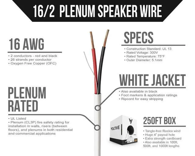 16AWG, 2 CONDUCTORS, WHITE JACKET, 250FT BOX. 16 gauge speaker cable, featuring 26 strand Oxygen-Free Copper conductors. Built to exacting standards with zero compromises. ^^ OXYGEN-FREE COPPER. Oxygen-free copper (OFC) conductors result in less signal loss and are more durable than conductors made of copper-clad aluminum (CCA). ^^ CL3P RATED. Plenum (CL3P) fire safety rating for installation in walls, risers (between floors), and plenums in both residential and commercial applications. UL Listed. ^^ TIME SAVING FEATURES. Patented winding technology & massive payout hole eliminate kinks and tangles.